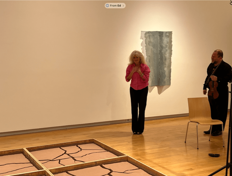 Opposite: composer Lisa Heffter acknowledging standing ovation at Aldrich Museum with brilliant quartet first violinist Jorge Avila